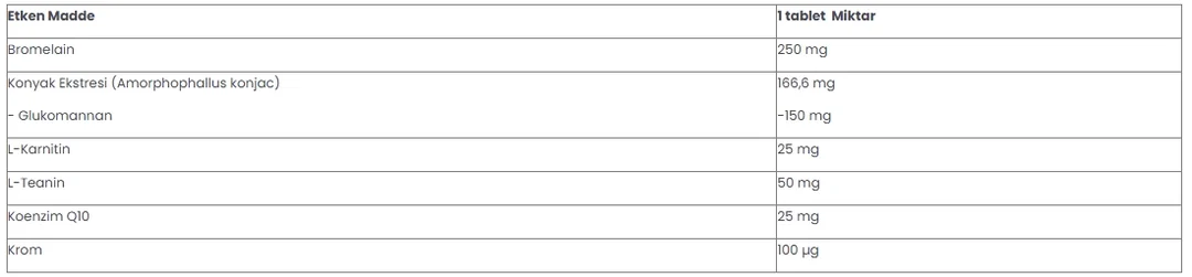 Sindirim sistemini destekleyen bromelain, tokluk hissi sağlayan glukomannan, yağ asitlerinin enerjiye dönüşümünü destekleyen L-karnitin, sakinliği korumaya yardımcı teanin ve hücresel enerji üretimini destekleyen koenzim Q10 sayesinde dengeli bir günlük yaşamı teşvik eder.