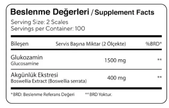 Saf Su, Maltitol (Stabilizör), Glukozaminoglikan, Akgünlük Ekstresi (Boswellia serrata), Böğürtlen Aroması (Aroma Verici), Vanilya Aroması (Aroma Verici), Biberiye Ekstraktı (Koruyucu).