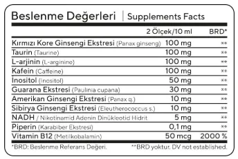 Çözücü Deiyonize Su, Kıvam Arttırıcı Gliserin, Taurin, L-Arjinin, Kafein, Kırmızı Kore Ginsengi (Panax ginseng) Ekstresi, İnositol, Guarana (Paulinia cupana) Ekstresi, Kıvam Arttırıcı Ksantam Gum, Amerikan Ginsengi (Panax quinquefolius) Ekstresi, Sibirya Ginsengi (Eleutherococcus senticosus) Ekstresi, Koruyucu Potasyum Sorbat, Koruyucu Sodyum Benzoat, NADH / Nikotinamid Adenin Dinükleotid Hidrit, Piperin, Metilkobalamin (Vitamin B12).