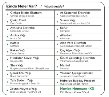 Aqua, Glyceryl Stearate, Ceteareth- , Ceteareth- , Cetyl Palmitate, Cetearyl Alcohol, Paraffinium Liqudium, Olea Europaea Fruit Pulp Oil, Ginkgo Biloba Extract, Zinc Oxide, Calendula Extract, Arnica Oil, Caffein, Cacao Butter, Coconat Oil, Butyrospermum Parkii (Shea) Butter, Black Cumin Oil (Çörek Otu Yağı), Prunus Amygdalus Seed Oil (Tatlı Badem Yağı), Aesculus Hippocastanum, Sesamum Indicum Seed Oil (Susam Yağı), Dimethicone, Camphor, Lanolin, Allantoin, Hydrolyzed Wheat Protein, Peg- Castor Oil, Monopropilenglikol, Gliserin, Aloe Barbadensis Leaf Extract, Melaleuca Alternifolia (Tea Tree) Leaf Oil, Vitis Vinifera Seed Extract, Peg- Glyceryl Cocoate, Menthol, Jasminum Grandiflorum, Citric Acid, Phenoxyethanol, Ethylhexylglycerin.