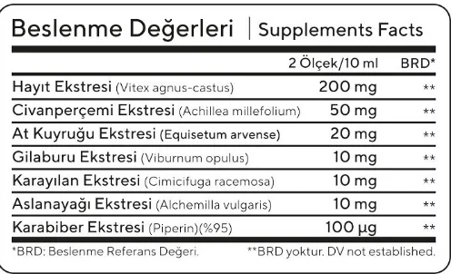 Çözücü Deiyonize Su, Kıvam Arttırıcı Gliserin, Hayıt (Vitex agnus c.) Ekstresi, Civanperçemi (Achillea m.) Ekstresi, At Kuyruğu (Equisetum ar.) Ekstresi, Kıvam Arttırıcı Ksantam Gam, Gilaburu (Viburnum op.) Ekstresi, Karayılan (Cimicifuga r.) Ekstresi, Aslanayağı (Alchemilla vulgaris) Ekstresi, Koruyucu Potasyum Sorbat, Koruyucu Sodyum Benzoat, Karabiber (Piper nigrum) Ekstresi (Piperin).