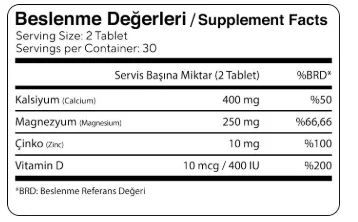 Kalsiyum Karbonat (Kalsiyum), Hacim Arttırıcı Mikrokristalin Selüloz, Magnezyum Hidroksit (Magnezyum), Stabilizör Polivinil Prolidon, Topaklanmayı Önleyici Yağ Asitlerinin Magnezyum Tuzları, Çinko Sülfat (Çinko), Stabilizör Çapraz Bağlı Sodyum Karboksi Metil Selüloz, Topaklanmayı Önleyici Silikon Dioksit, Kolekalsiferol (Vitamin D).