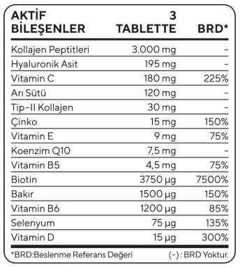 Vitamin C, cildin normal fonksiyonu için gerekli olan normal kollajen oluşumuna, bağışıklık sisteminin normal fonksiyonuna katkıda bulunur ve hücreleri oksidatif strese karşı korur.** Çinko, bağışıklık sisteminin normal fonksiyonuna ve normal saçların, cildin ve tırnakların korunmasına katkıda bulunur.** Biotin, normal saçın ve cildin korunmasına katkıda bulunur.** Selenyum, bağışıklık sisteminin normal fonksiyonuna katkıda bulunur.** Bakır, normal saç ve cilt pigmentasyonunun korunmasına katkıda bulunur.** Vitamin D, bağışıklık sisteminin normal fonksiyonuna katkıda bulunur.** Vitamin B6, yorgunluk ve bitkinliğin azalmasına katkıda bulunur.** Vitamin E, hücreleri oksidatif stresten korur.** Vitamin B5, enerji yapım metabolizmasında rol oynar, normal zihinsel performansı destekler ve yorgunluğun azalmasına katkı sağlar.**